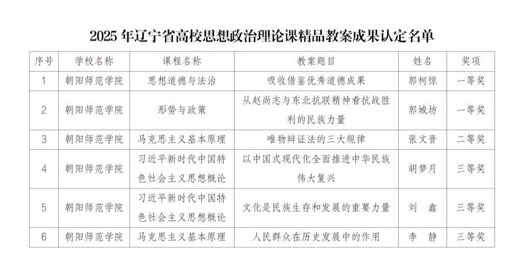 近日,辽宁省教育厅公布了2025年辽宁省高校思想政治理论课精品教案获奖名单,我院6位思政课教师申报的教案获奖,其中,郭柯惊、郭城坊老师荣获一等奖,张文晋老师荣获二等奖,胡梦月、刘鑫、李静老师荣获三等奖3人。